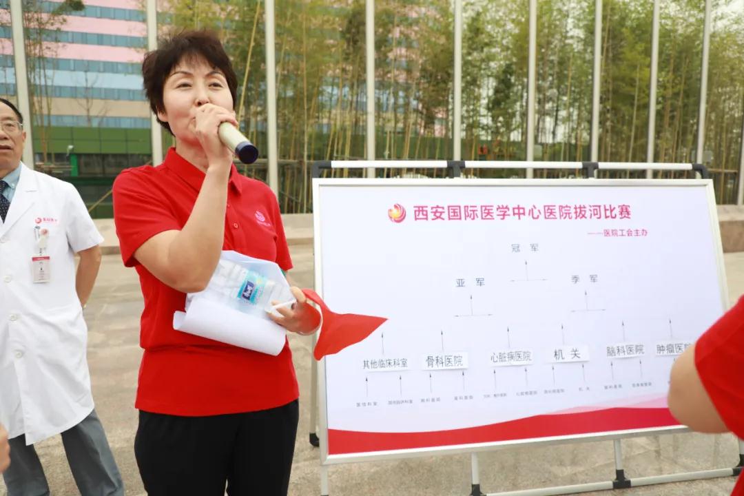在院慶一周年之際,西安國際醫(yī)學中心醫(yī)院舉行“凝心聚力展風采”拔河比賽,來自各機關部門、??漆t(yī)院、科室共有11支隊伍275名隊員參加。王志峰總經理親臨現(xiàn)場觀摩活動并為參賽隊員加油助威。